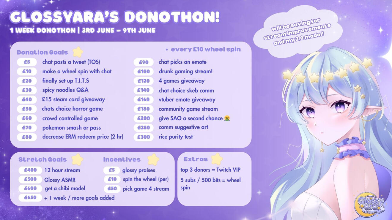 Hi! I am Glossyara, but you can call me Glossy! I am a celestial elf vtuber and a variety gamer on twitch!I started Twitch on the 12th of April 2024 (12/04/2024) which was also my debut stream! Earning affiliate on the 22nd of April 2024 (22/04/2024)
