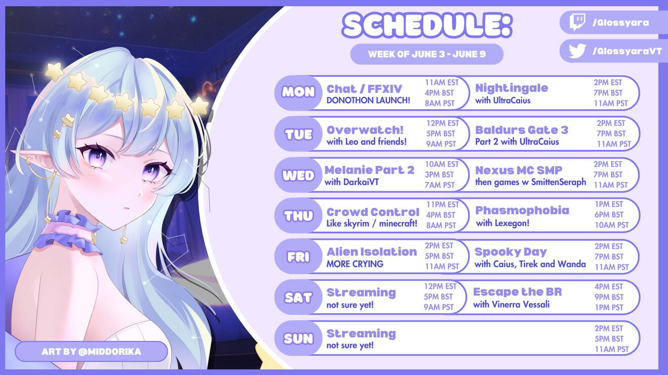 This is my weekly schedule, I aim to update this every week, however twitter and discord will 100% be up to date!I am usually live all week excluding wednesdays and sundays!